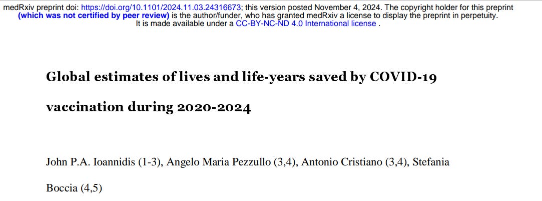 Dr. Weiler, your assessment of the new Ioannidis preprint seems quite charitable, in particular stating at the end that the “effort to estimate life-years saved—while controversial—represents a meaningful attempt to quantify broader benefits beyond mortality reduction.” Your use of the term “meaningful” in this context is far too kind. Ioannidis and colleagues cite two papers that address serious adverse events (Fraiman et al's and Bardosh et al's), then go on to omit the SAEs from their analysis, even though their inclusion would directly and profoundly impact the life-years saved calculus. Aside from this minuscule sampling of the adverse events literature, excluding SAEs introduces significant bias, as these events directly impact the life expectancy of individuals who experience them, particularly in younger populations where the theoretical benefits of the modified mRNA injections are more marginal and the risks (e.g., myocarditis, with long-range risk of heart failure) more dramatic. Without incorporating SAEs, the estimate of life-years preserved becomes artificially inflated, as it fails to consider the potential real-life consequences of vaxx-related outcomes such as deaths or life-threatening conditions. Furthermore, the omission of SAEs fails to honor the fundamental epidemiologic/public health principle of weighing both benefits AND risks. Given that SAEs can lead to long-term health impairments, including the reduction of life expectancy, their exclusion undermines the accuracy and validity of any life-year calculations. It is difficult to understand how someone of Ioannidis’s stature could reasonably begin to calculate life-years saved without attempting to include SAEs as part of the equation. I encourage your readers to read our two-part Lessons Learned review for a comprehensive overview of these adverse events and other examples of how the scientific community has attempted to obscure, distort, and sidestep their relevance.