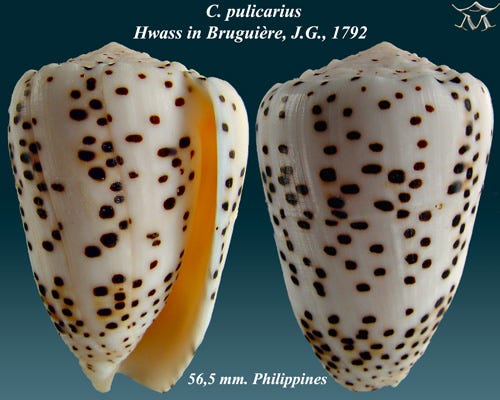 Conus pulicarius, common name the flea-bitten cone, is a species of sea snail, a marine gastropod mollusk in the family Conidae, the cone snails and their allies. (Source: Wikipedia).