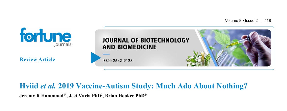 Hammond JR, Varia J, Hooker B. Hviid et al. 2019 Vaccine-Autism Study: Much Ado About Nothing? Journal of Biotechnology and Biomedicine. 2025;8(2):118–140.