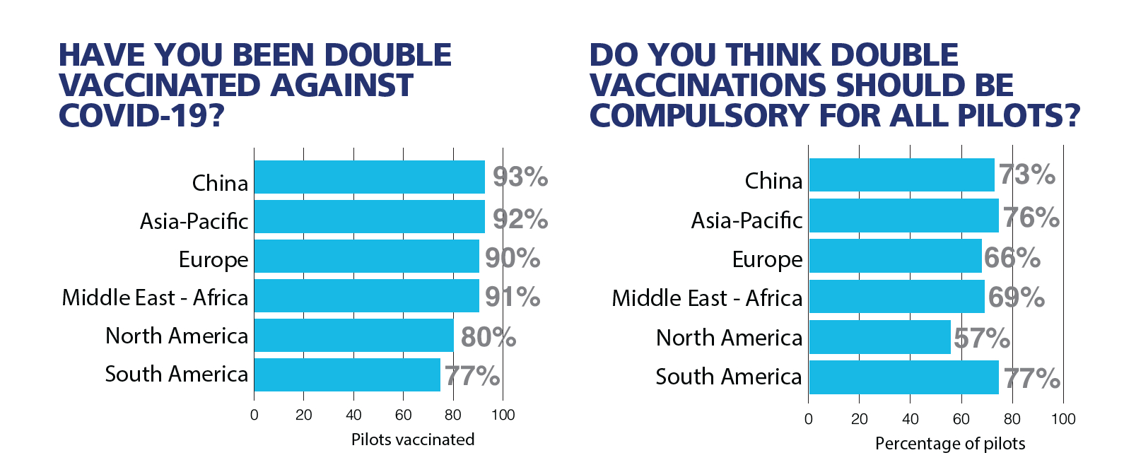 The also survey found that 20% of pilots in North America are not “fully vaccinated”, while 43% reported that they felt that “double vaccinations” should not be compulsory for all pilots.