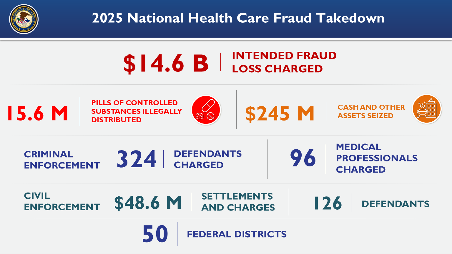 The Department of Justice today announced the outcome of the 2025 National Health Care Fraud Takedown, the largest coordinated enforcement action against health care fraud in U.S. history. Federal prosecutors have filed criminal charges against 324 individuals across 50 federal judicial districts and 12 State Attorneys General’s Offices, including 96 licensed medical professionals—among them doctors, nurse practitioners, and pharmacists. The defendants stand accused of orchestrating fraudulent schemes amounting to more than $14.6 billion in intended losses to Medicare, Medicaid, and other federally funded programs.