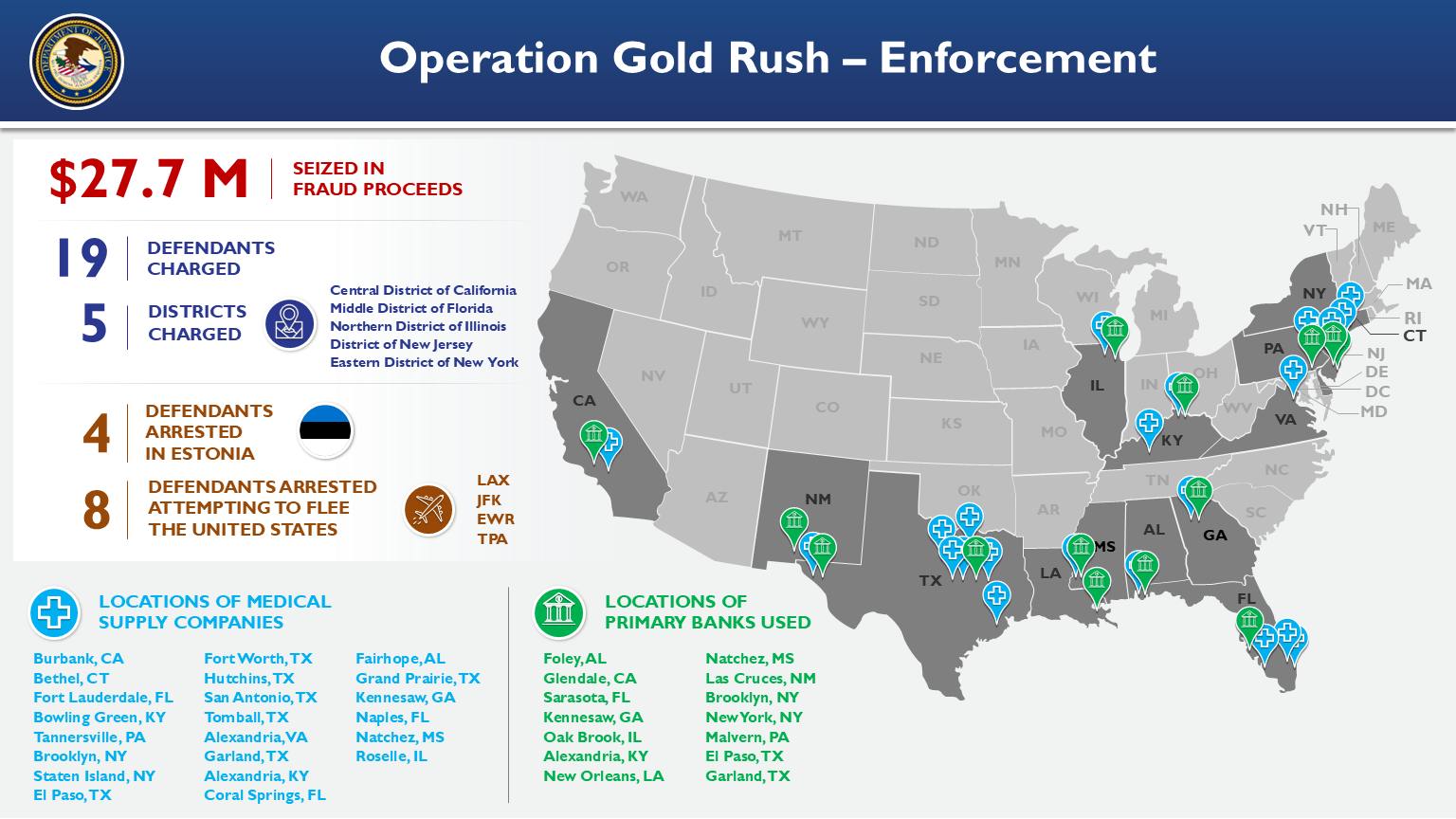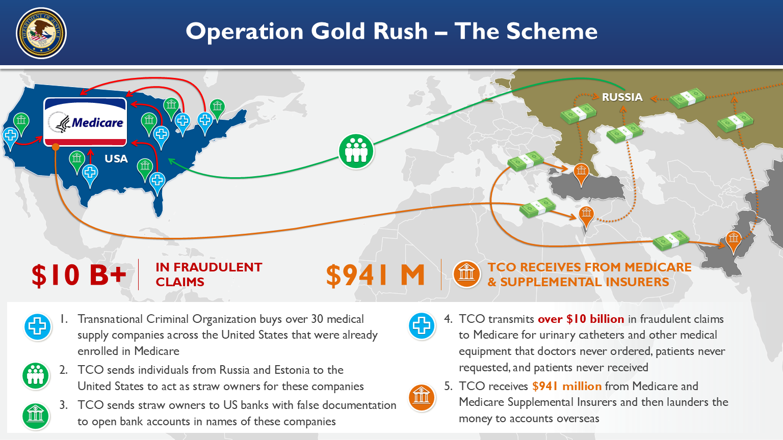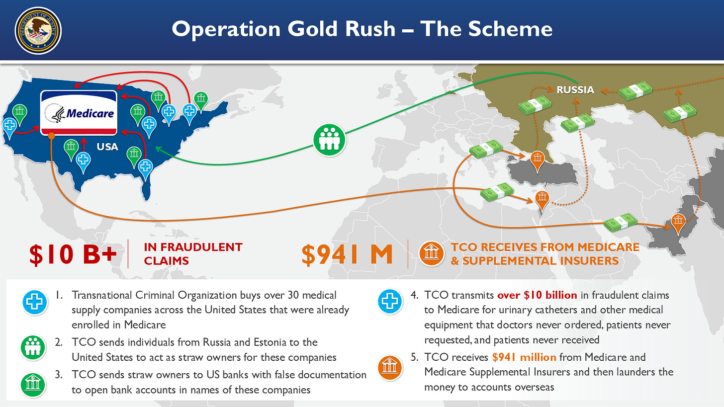 Among the most significant components of this national operation was Operation Gold Rush, which uncovered a sophisticated transnational conspiracy responsible for over $10 billion in fraudulent Medicare claims. The scheme was orchestrated by foreign nationals who, acting as a coordinated criminal enterprise, acquired more than 30 medical supply companies across the United States. These companies had already been enrolled in Medicare, and were then used to funnel false claims for urinary catheters and other durable medical equipment. Stolen identities of over one million Americans were used to submit these claims, which had not been requested by patients, nor ordered by physicians.