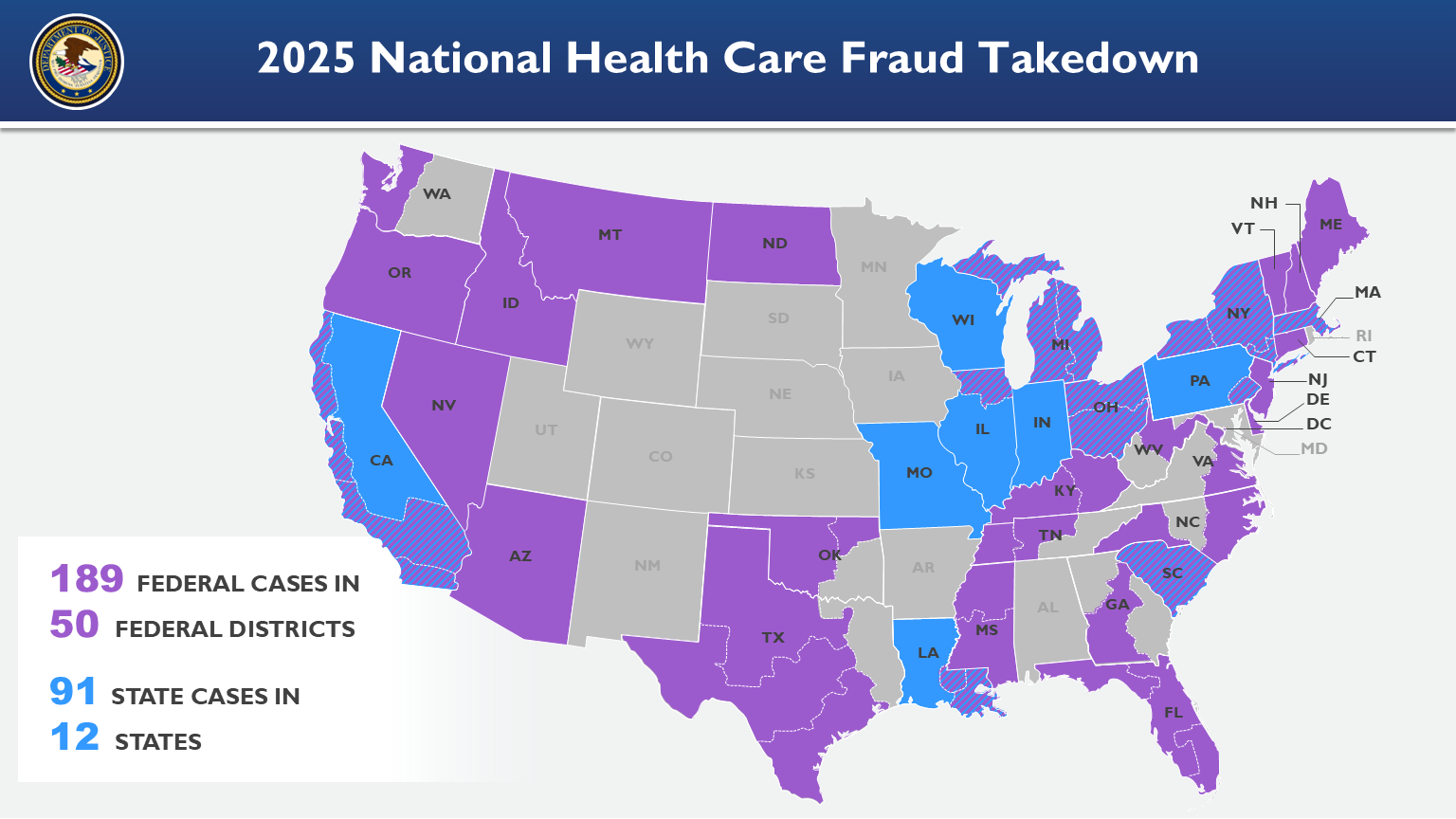 The geographic scope of the Takedown was vast. In total, 189 federal cases were filed across all 50 federal judicial districts, and 91 state-level cases were brought in 12 states by participating Attorneys General. This unprecedented coordination underscores the national impact and bipartisan support for rooting out fraud in American health care systems.