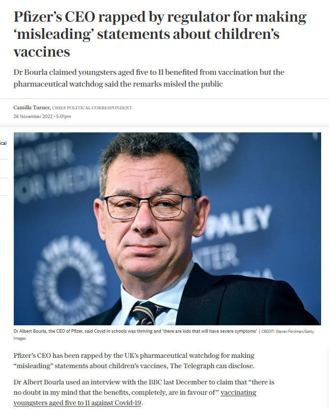 Pfizer CEO Albert Bourla had previously been chided for creating claims about COVID19 vaccine efficacy out of thin air. Here is the Telegraphs’ coverage.