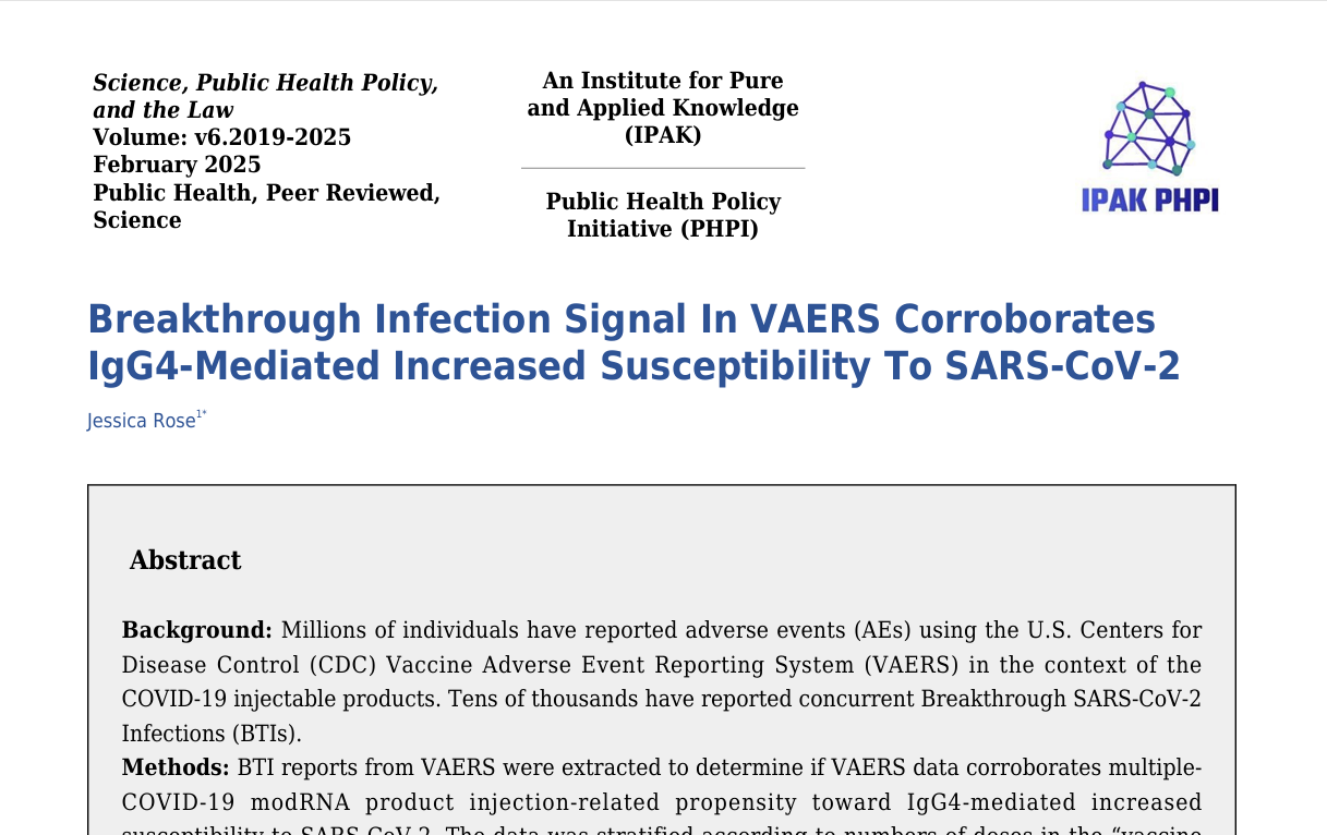 Rose J. Breakthrough Infection Signal In VAERS Corroborates IgG4-Mediated Increased Susceptibility To SARS-CoV-2. Science, Public Health Policy and the Law. 2025 Mar 01; v6.2019-2025. https://publichealthpolicyjournal.com/breakthrough-infection-signal-in-vaers-corroborates-igg4-mediated-increased-susceptibility-to-sars-cov-2/