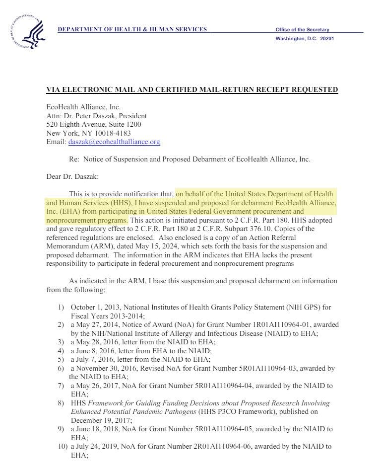 Per the Select Subcommittee: The U.S. Department of Health and Human Services commenced formal debarment proceedings against EcoHealth Alliance. EcoHealth will now face an immediate, government-wide suspension of taxpayer funds, including a hold on all active grants.