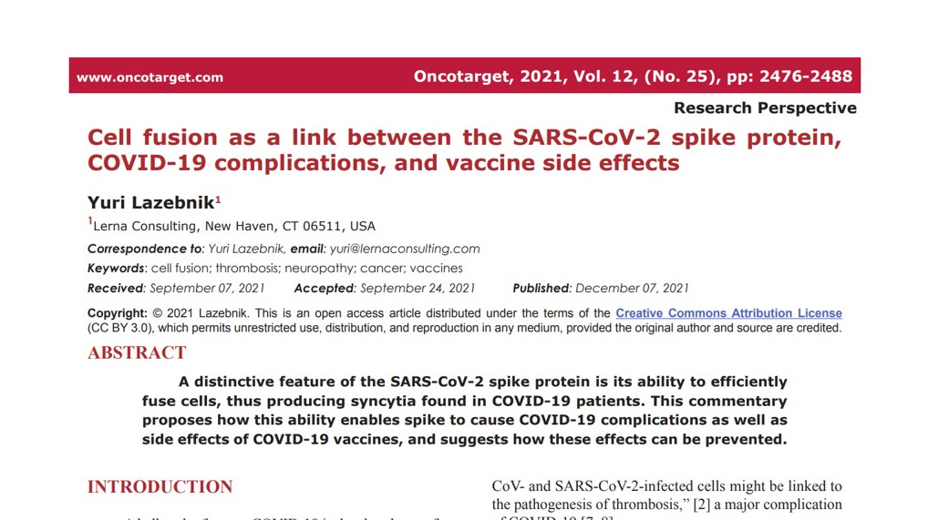 This paper describes the efficiency with which the SARS-CoV-2 spike protein leads to syncytia (the fusion of two or more human cells) and suggests that many of the side-effects of the vaccine (and COVID-19 ‘complications’) may be explained by the biotoxicity of the spike protein. The concerns are those we now know all too well: heart inflammation, neurological effects, and potentially, neoplasms.