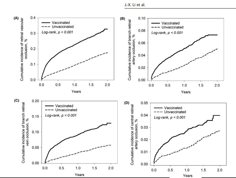 “The cumulative incidence of retinal vascular occlusion was significantly higher in the vaccinated cohort compared to the unvaccinated cohort, 2 years and 12 weeks after vaccination. The risk of retinal vascular occlusion significantly increased during the first 2 weeks after vaccination and persisted for 12 weeks. Additionally, individuals with first and second dose of BNT162b2 and mRNA-1273 had significantly increased risk of retinal vascular occlusion 2 years following vaccination, while no disparity was detected between brand and dose of vaccines.” (Reference)