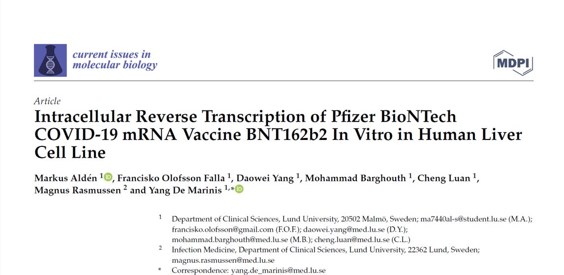 Aldén M, Olofsson Falla F, Yang D, Barghouth M, Luan C, Rasmussen M, De Marinis Y. Intracellular Reverse Transcription of Pfizer BioNTech COVID-19 mRNA Vaccine BNT162b2 In Vitro in Human Liver Cell Line. Curr Issues Mol Biol. 2022 Feb 25;44(3):1115-1126. doi: 10.3390/cimb44030073. PMID: 35723296; PMCID: PMC8946961.