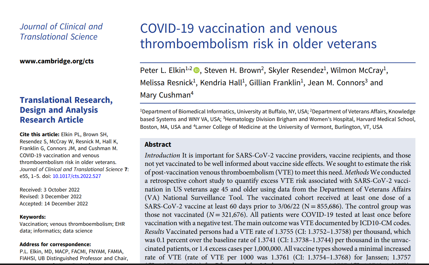 This study by Peter Elkin et al., which specifically addresses concerns over clotting claims to find no association between COVID-19 mRNA jabs and clotting. Their results, however, are dependent on an “adjustment” using “age, sex, BMI, 2-year Elixhauser score, and race…”