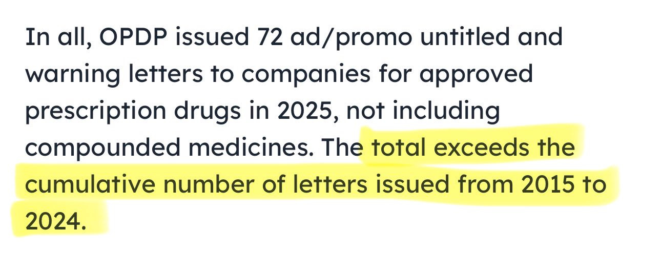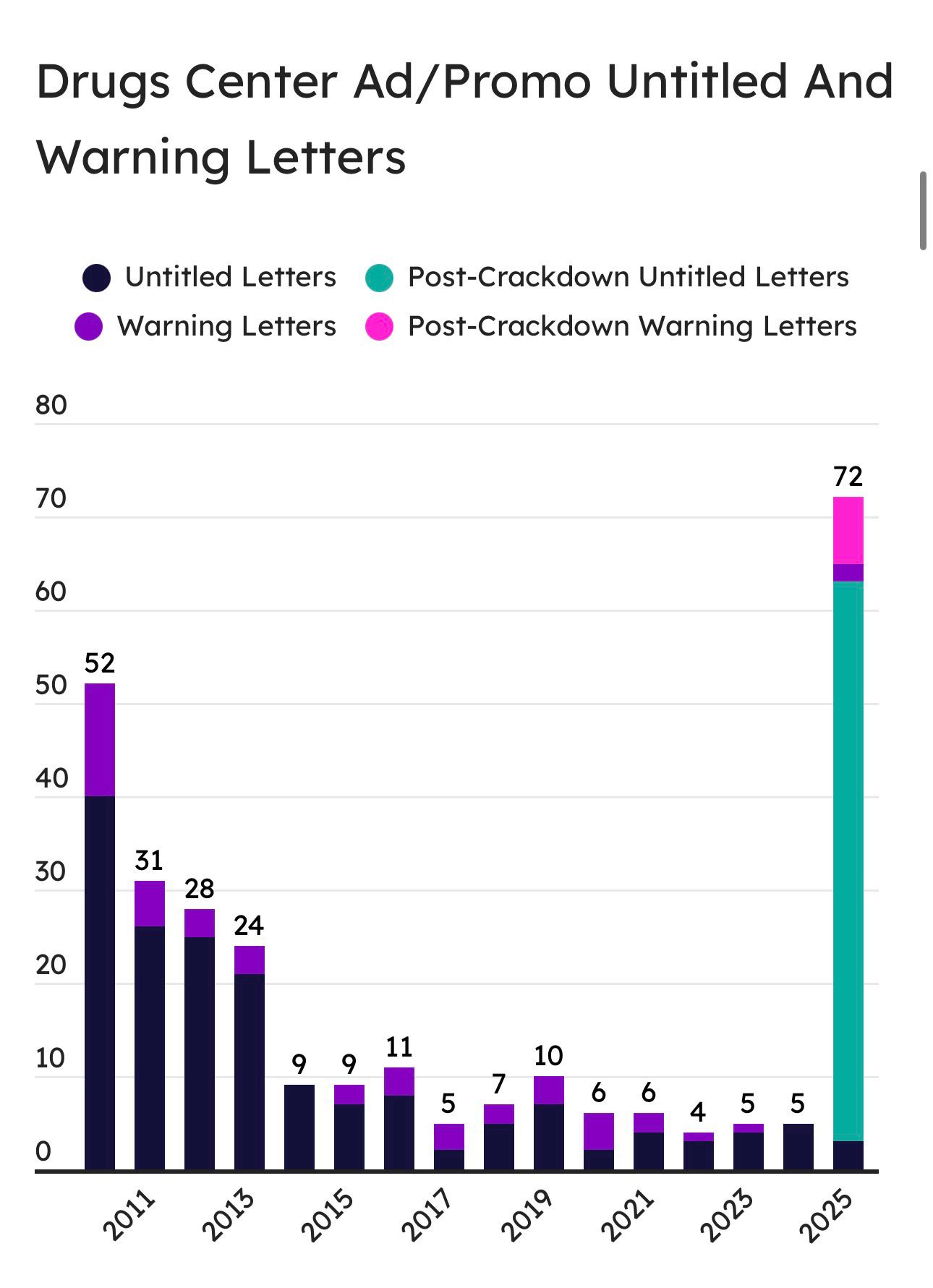 From 2015 to 2024, the OPDP issued between 4 and 11 promotional compliance letters annually. In 2025 alone, that number spiked to 72, exceeding the total for the entire prior decade. A plurality of those 72 were untitled letters triggered by post-marketing surveillance of high-profile DTC ads, particularly on television and social media. Several warning letters were also issued, particularly in Q3 and Q4, where sponsors failed to disclose serious risks, overstated efficacy, or made unsupported superiority claims. As of January 2026, multiple untitled letters have already been posted, signaling that this is not an anomaly but an emerging enforcement regime.