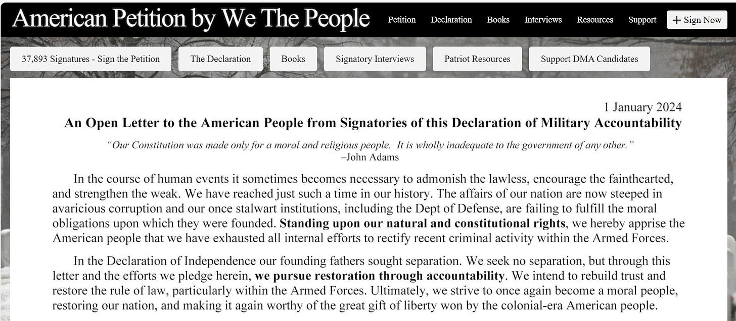 Additionally, the January 1, 2024, letter (now signed my over 37K Americans) can be accessed (See militaryaccountability.net).