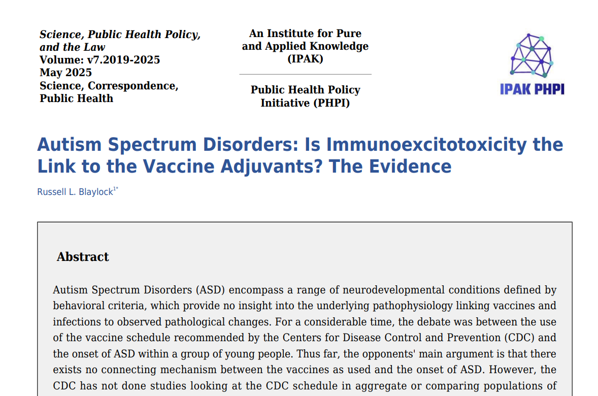 Blaylock R L. Autism Spectrum Disorders: Is Immunoexcitotoxicity the Link to the Vaccine Adjuvants? The Evidence. Science, Public Health Policy and the Law. 2025 May 31; v7.2019-2025