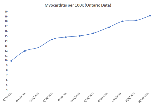 Data from Ontario, Canada show an increase in myocarditis over time - increases from baseline - as vaccination increased over time - a population-level dose-dependent response not expected unless causality was in play.