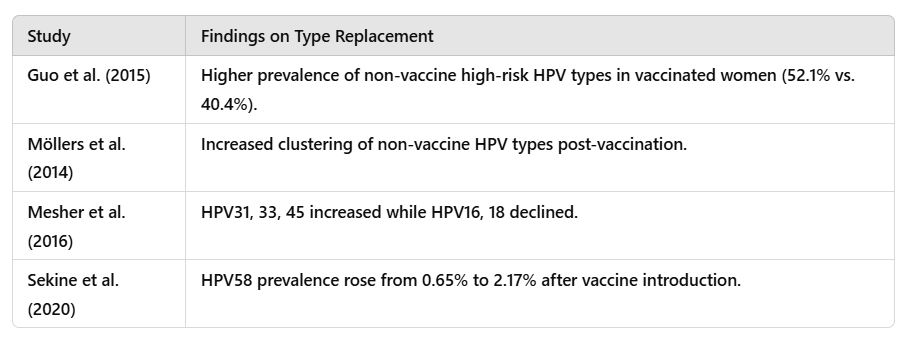 Rositch et al. (2012) concluded that there was no evidence of type replacement, yet their study only analyzed a limited number of HPV types rather than conducting broad-spectrum genotyping. Similarly, Maver & Poljak (2015) claimed that HPV type replacement was unlikely, yet they did not systematically track non-vaccine HPV types over time.