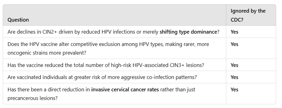 Rather than conducting a comprehensive evaluation of whether non-vaccine HPV types are filling the ecological void left by HPV16 and HPV18 suppression, the CDC relies on ecologic trend analysis, which assumes a causal link between vaccination and declining CIN rates without directly measuring the full spectrum of HPV infections. This omission raises serious concerns about whether the conclusions of the report accurately reflect the evolving epidemiology of HPV in a post-vaccine era. If non-vaccine high-risk HPV types are increasing while vaccine-targeted types decline, then the total risk of HPV-driven cervical disease may remain unchanged or could even increase over time.