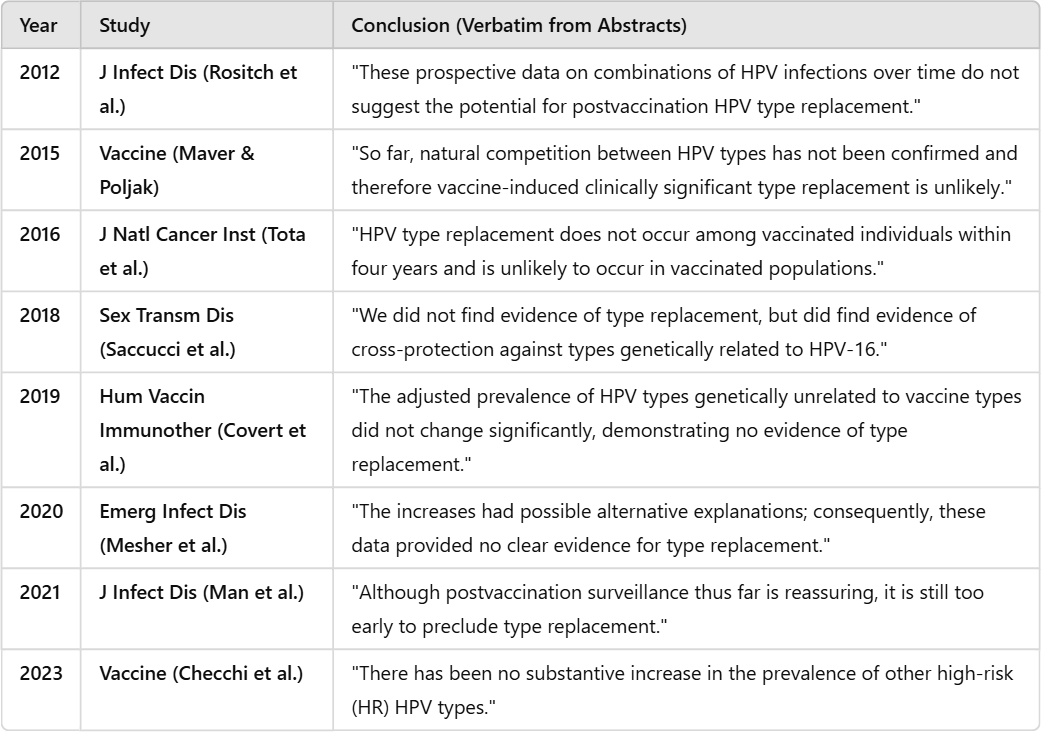 One of the most glaring weaknesses in these studies is the insufficient follow-up period used to assess type replacement. HPV-related cervical cancer typically takes decades to develop, meaning that increases in non-vaccine HPV types may not become evident for another 10 to 20 years post-vaccination. Yet, many of the studies cited as evidence against type replacement fail to extend beyond a few years, making their conclusions unreliable.