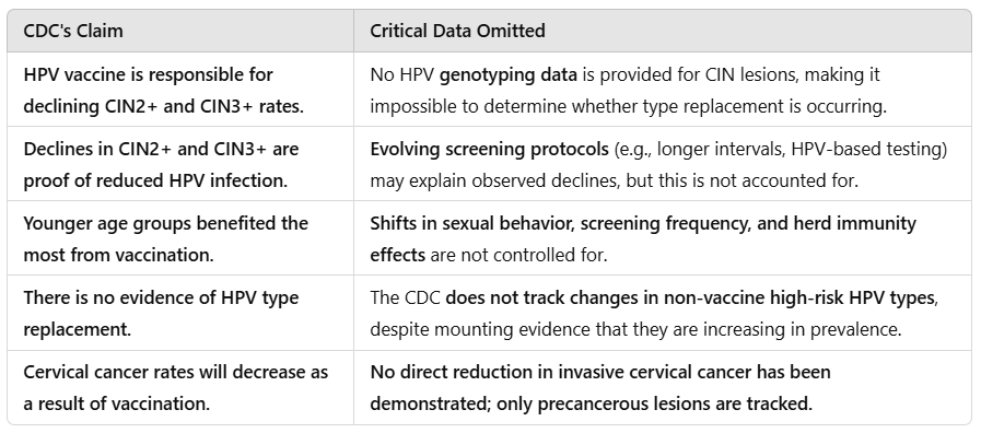 The most glaring omission in the CDC report is its failure to provide a breakdown of CIN lesion rates by HPV genotype. This makes it impossible to distinguish between reductions in vaccine-targeted HPV infections (16, 18) and potential increases in non-vaccine high-risk types (31, 33, 52, 58, among others.). Without such data, the CDC’s assertion that HPV vaccination is reducing precancer rates is an illusion based on a dangerously incomplete picture.
