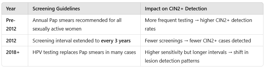 These changes have substantially altered the detection rates of cervical abnormalities. If women are screened less frequently, fewer CIN2+ and CIN3+ cases are expected to be detected—not necessarily because they no longer exist but because they are no longer being identified as often.
