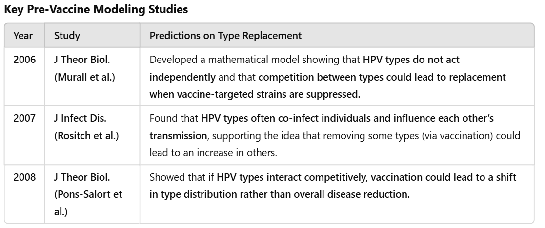 Before the CDC’s initial Markowitz et al. study, theoretical models had also already warned of the potential for type replacement. These models suggested that removing certain high-risk HPV types via vaccination could lead to an increase in other oncogenic types, particularly if those types occupied similar ecological niches.