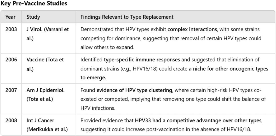Before the CDC's 2008 HPV vaccine study led by Markowitz detected type replacement but failed to report it, there were already concerns regarding HPV type replacement and the long-term ecological effects of HPV vaccination. These concerns were not speculative—they were supported by epidemiological and theoretical models, as well as pre-vaccine era studies analyzing the competitive dynamics between different HPV strains.