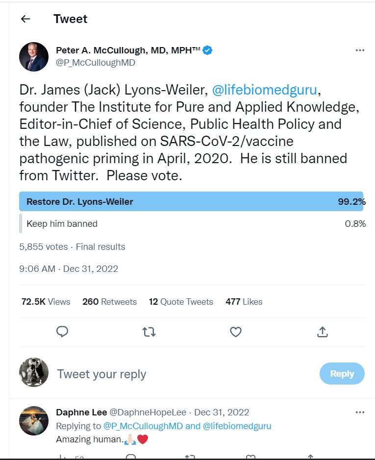 Dr. McCullough asked, and the community has responded. The results are humbling (5,855 voted, 99.2% said “Restore Dr. Lyons-Weiler”).