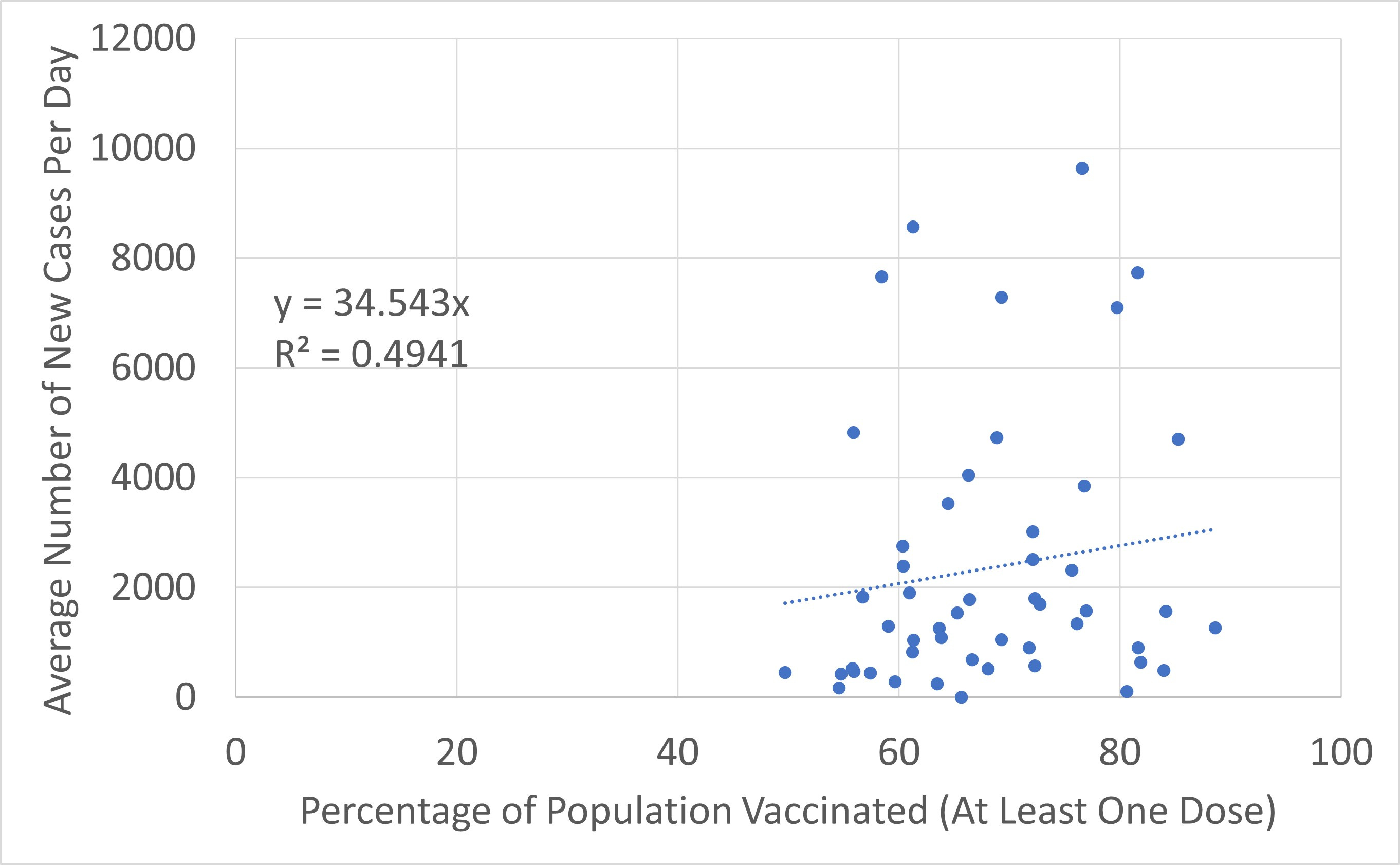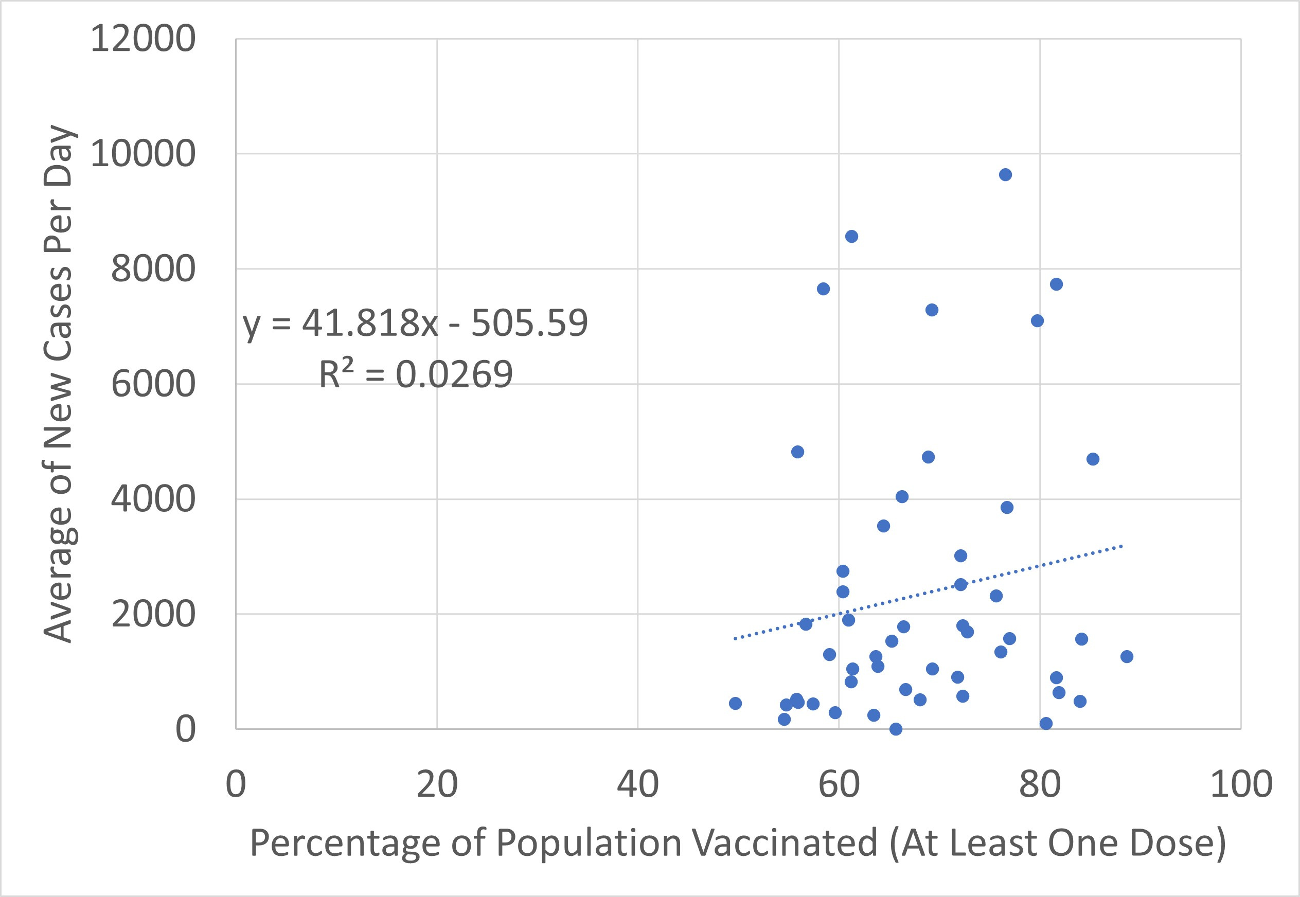 The most anyone can say about these data with reliability is that something is causing the expected relationship to fail to manifest. There is certainly no evidence in the all-states level data that vaccination contributes to a reduction in the number of new cases.