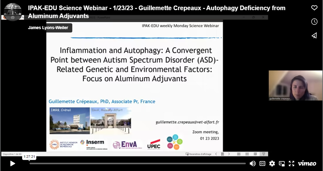 IPAK-EDU Science Webinar Video - 1/23/23 - Guillemette Crepeaux - Autophagy Deficiency from Aluminum Adjuvants
