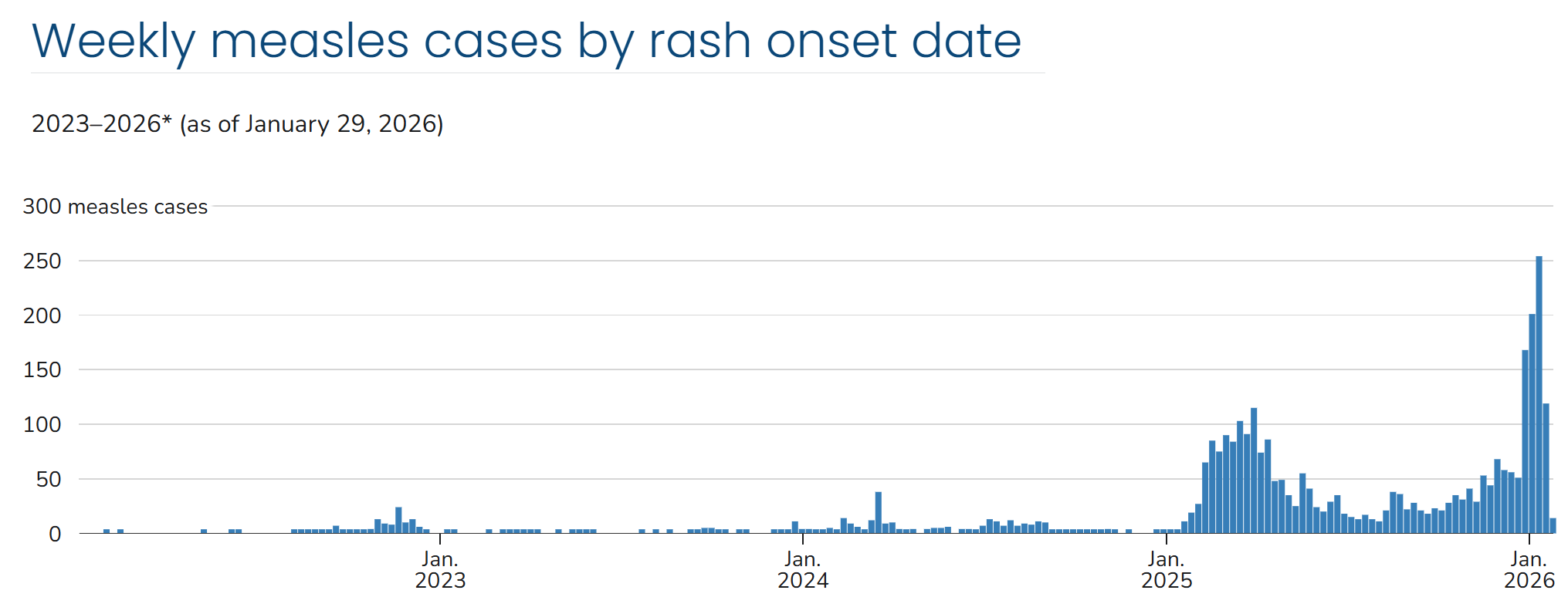 As of January 29, 2026, the CDC has confirmed 588 measles cases for the year. Over 90% are part of outbreak chains that began in 2025. That year closed with 2,267 confirmed cases—the most since 1992 and more than eight times the total from 2024. CDC acknowledges these numbers are preliminary.