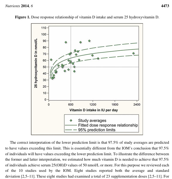 The IOM used a group of studies to model how vitamin D intake affects blood levels. Instead of calculating how individuals respond to vitamin D, they mistakenly used the average responses from different studies. This might seem minor, but it has major consequences. What the IOM actually calculated was the amount of vitamin D needed for 97.5% of study averages to exceed 50 nmol/L—not for 97.5% of people.