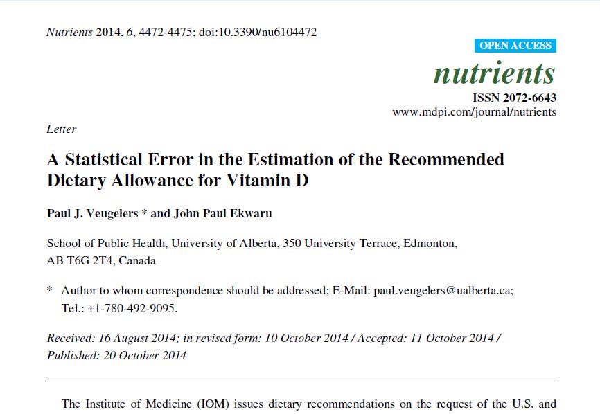 That sounds like a technicality. It’s not. This mistake led the IOM to declare that 600 IU per day would get virtually everyone to a healthy level. But when University of Alberta researchers reanalyzed the same data correctly, they found that 600 IU/day only ensured 26.8 nmol/L in 97.5% of individuals—not 50. To get 97.5% of individuals above 50 nmol/L, the real required intake was closer to 8,895 IU/day — more than 14 times the current RDA. [Veugelers & Ekwaru, Nutrients 2014; 6:4472–45]