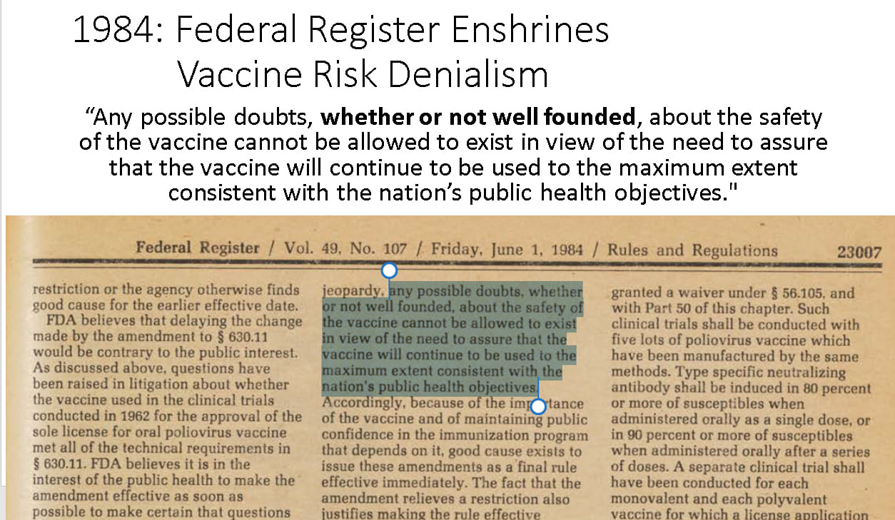 I was gratified to see Lex, in a previous podcast, decry the bullshit Vaccine Adverse Events Tracking System. Lex is a far more generous scientist that I am. But he does not yet understand that it is in the very DNA of vaccinologists, the CDC, and the rest of the HHS to never allow the public to learn of any risk of vaccination. He does not yet know that it’s in the Federal Register, from 1984: