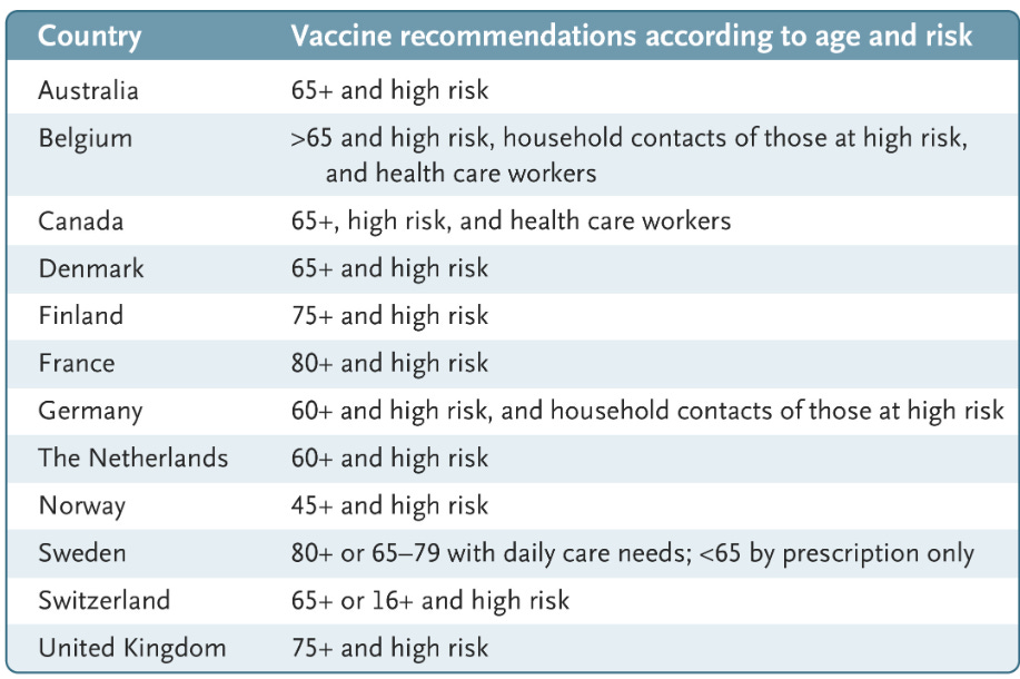 Over the past 5 years, the United States has moved toward an annual Covid-19 booster program. Each fall, Covid-19 booster shots are developed, alongside seasonal influenza vaccines, and are recommended for every American. As compared with vaccination policies in all European nations, the U.S. policy has been the most aggressive (see Figure 1).1 While all other high-income nations confine vaccine recommendations to older adults (typically those older than 65 years of age), or those at high risk for severe Covid-19, the United States has adopted a one-size-fits-all regulatory framework and has granted broad marketing authorization to all Americans over the age of 6 months.1 The U.S. policy has sometimes been justified by arguing that the American people are not sophisticated enough to understand age- and risk-based recommendations.2 We reject this view.