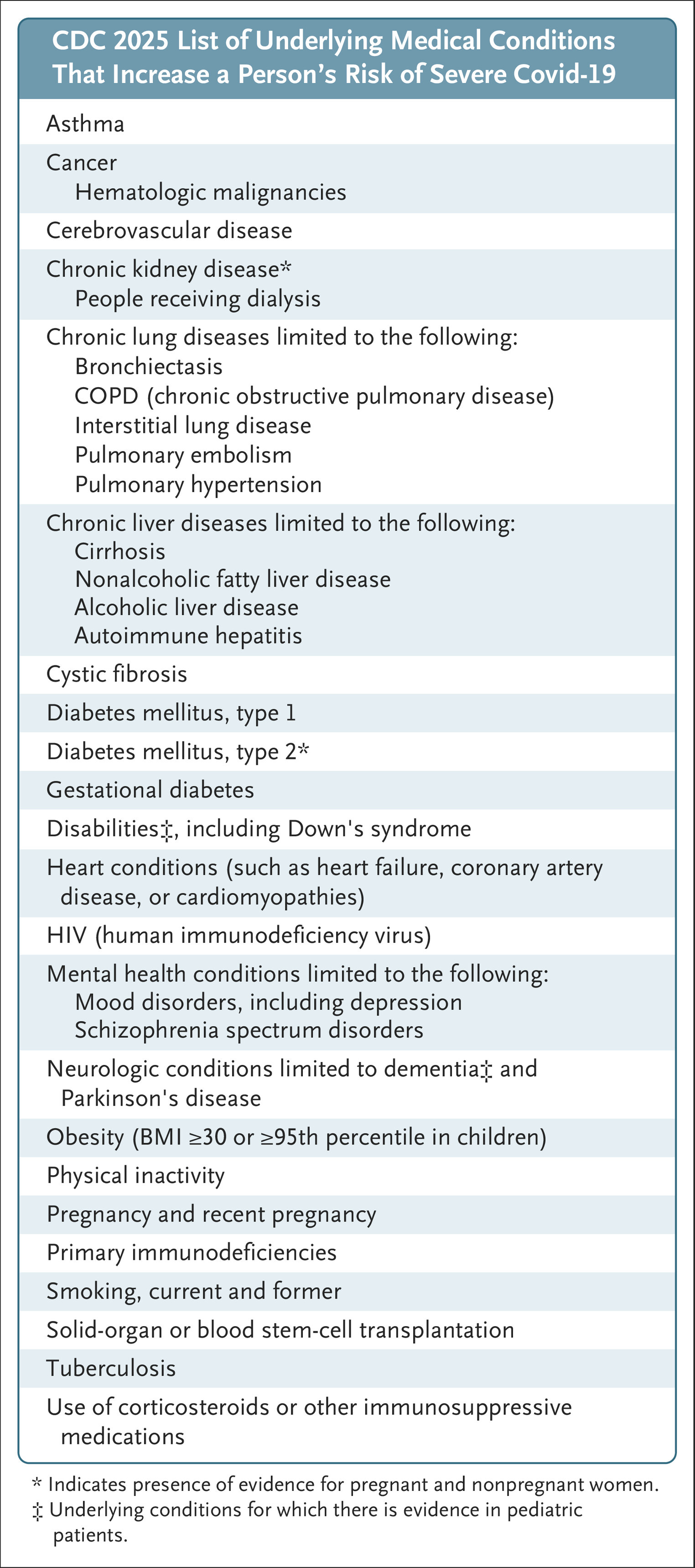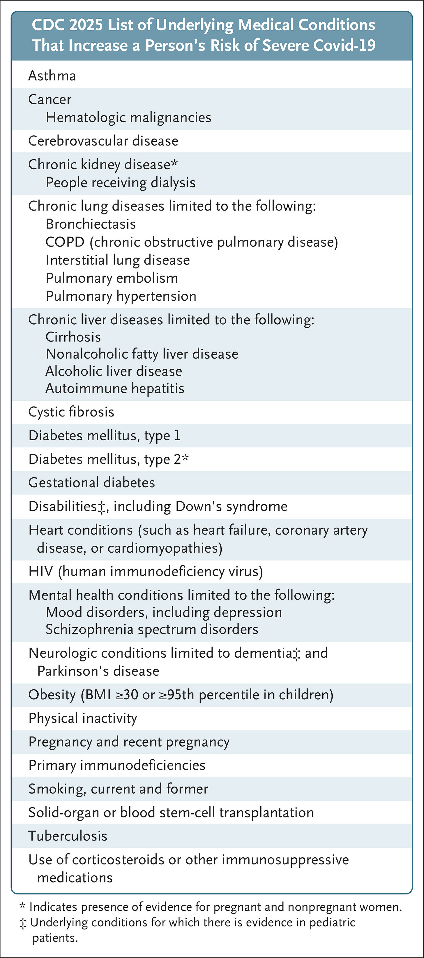 Centers for Disease Control and Prevention. People with certain medical conditions and Covid-19 risk factors. January 6, 2025 (https://www.cdc.gov/covid/risk-factors/index.html).
