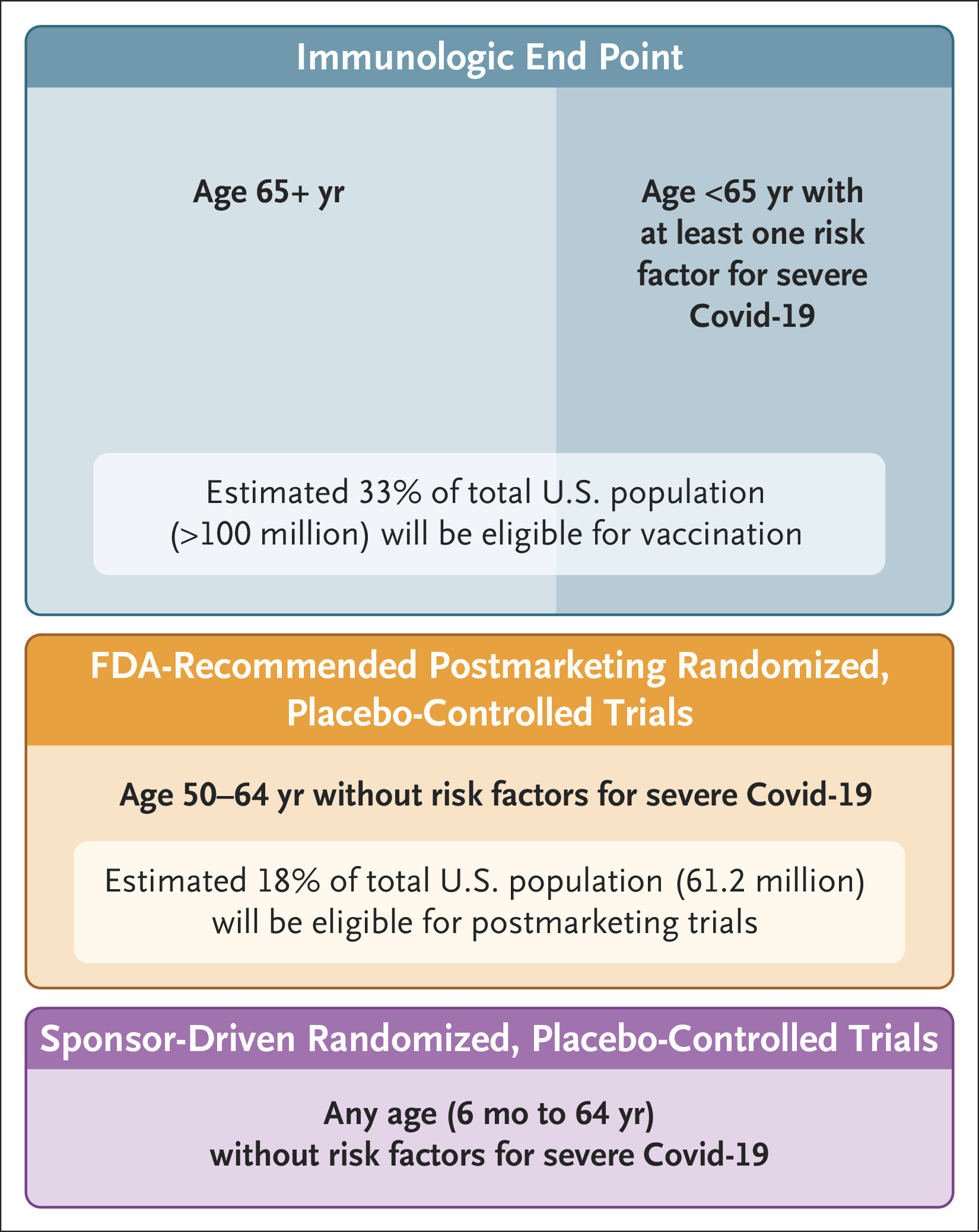 Moving forward, the FDA will adopt the following Covid-19 vaccination regulatory framework: On the basis of immunogenicity — proof that a vaccine can generate antibody titers in people — the FDA anticipates that it will be able to make favorable benefit–risk findings for adults over the age of 65 years and for all persons above the age of 6 months with one or more risk factors that put them at high risk for severe Covid-19 outcomes, as described by the CDC (Figure 2). For all healthy persons — those with no risk factors for severe Covid-19 — between the ages of 6 months and 64 years, the FDA anticipates the need for randomized, controlled trial data evaluating clinical outcomes before Biologics License Applications can be granted. Insofar as possible, when approving a Covid-19 vaccine for high-risk groups, the FDA will encourage manufacturers to conduct randomized, controlled trials in the population of healthy adults as part of their postmarketing commitment.