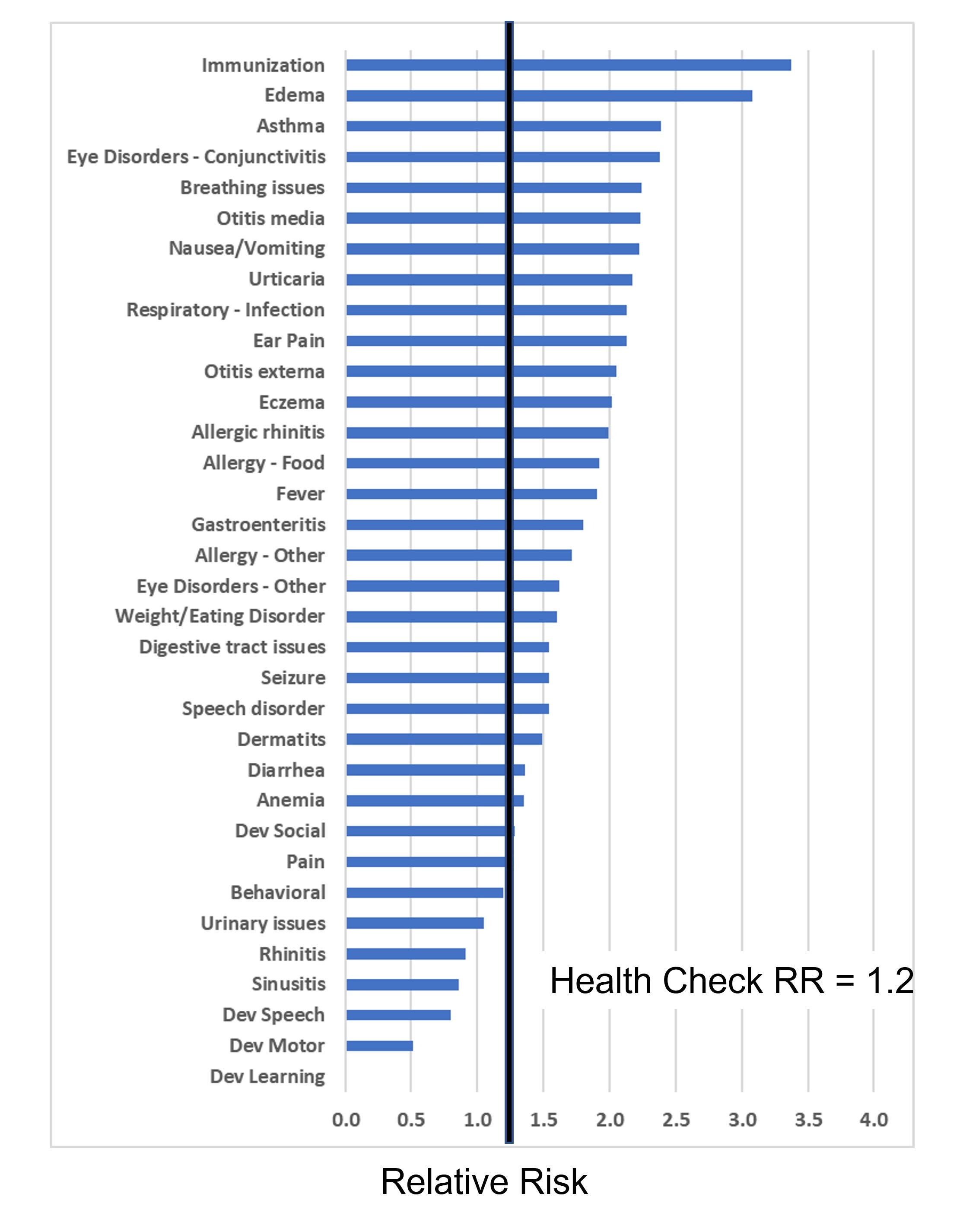 Relative risk of adverse health outcomes in older children who continued to vaccinate compared to those who ceased vaccination in Dr. Thomas’ practice.