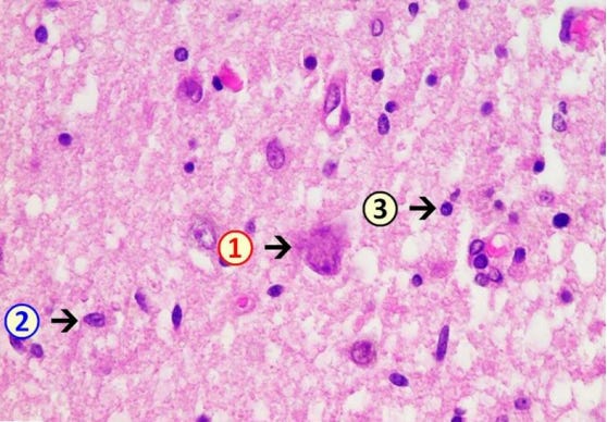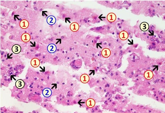 Mörz Figure 2b: Acute brain damage (due to necrotizing encephalitis) is visible with diffuse and zonal neuronal and glial cell death, activation of microglia, and inflammatory infiltration by granulocytes and lymphocytes. 1: neuronal deaths (cells with red cytoplasm); 2: microglial proliferation; 3: lymphocytes.