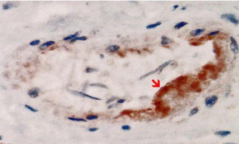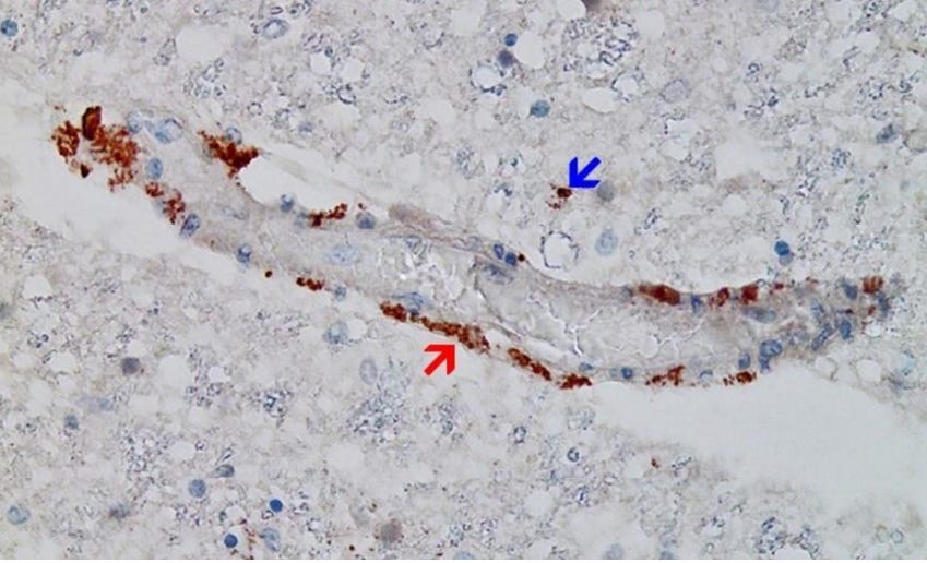 Among the most remarkable findings were that: the vasculitis, encephalitis, and myocarditis were associated with deposits of spike protein, and the spike protein was vaccinal in origin. As the next several images will show, spike protein was documented to be present within the walls of small blood vessels and also within brain and heart tissue. Inflammatory cells (primarily lymphocytes) were found next to the deposited spike protein. Spike protein could be demonstrated only in the areas with acute inflammatory reactions (brain, heart, and small blood vessels), in particular in endothelial cells, microglia, and astrocytes. The most logical interpretation of these findings is that vaccinal spike protein provoked an inflammatory reaction (by the immune system), resulting in vasculitis, encephalitis, and myocarditis.