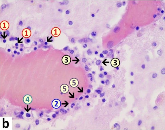 Mörz Figure 4b: Endothelial cells are the cells that line the inner walls of blood vessels. In this image, endothelial cells (5) are swollen and vacuolated and are increased in number with enlargement of nuclei, indicative for activation. Furthermore, within the endothelial layer there is a mixture of different types of inflammatory cells, consisting of lymphocytes (1), granulocytes (2), and histiocytes (4). The adjacent brain tissue also shows signs of inflammation (encephalitis) with presence of lymphocytes as well as activated microglia (3). Lymphocytes are inflammatory cells (such as T lymphocytes). Microglia are macrophages that reside in the brain. A major task of microglia is to engulf and incinerate dead cells. The main finding in this image is inflammation in the vessel wall—i.e. vasculitis.