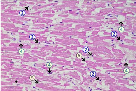Mörz Figure 5a: Heart left ventricle. Mild lympho-histiocytic myocarditis. Mild lympho-histiocytic infiltrates (2 + 4). Signs of cardiomyocytic degeneration (5) with cytoplasmic hypereosinophilia and single contraction bands.