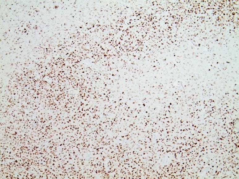 Mörz Figure 6: Frontal brain. Diffuse, multifocal necrotizing encephalitis. Immunohistochemistry for CD68 (expressed by monocytic cells). Note map-like tissue destruction with the presence of CD68-positive microglial cells. Furthermore zonal activation of microglia (brown granules). Activation of the microglia means that tissue destruction has taken place in the brain, and macrophages (called microglia in the brain) are clearing/removing the cellular debris. Brown granules: macrophages/microglia.