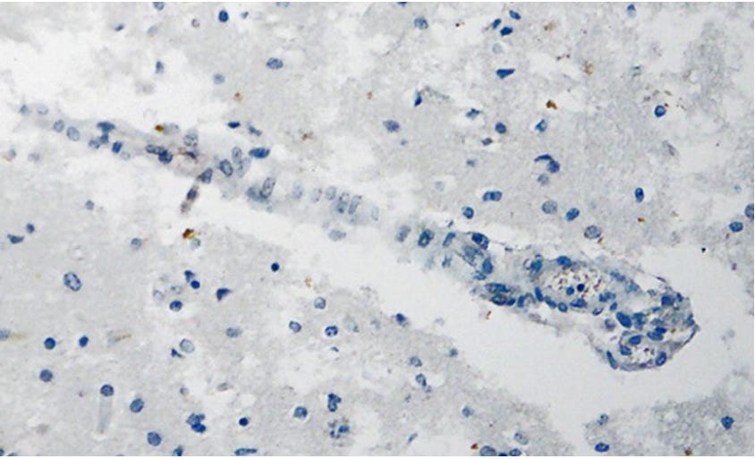 Mörz Figure 11: Frontal brain. Negative immunohistochemical reaction for SARS-CoV-2 nucleocapsid protein. Cross section through a capillary vessel (same vessel as shown in Figure 9, serial sections of 5 to 20 µm). This image documents that nucleocapsid protein was not present, at least in this vessel.