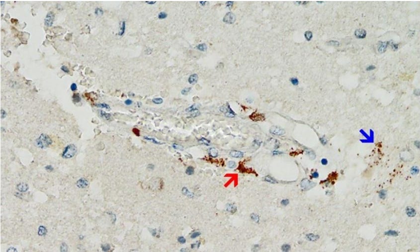 Mörz Figure 9: Frontal brain. Positive reaction for SARS-CoV-2 spike protein. Cross section through a capillary vessel. Immunohistochemical reaction for SARS-CoV-2 spike subunit 1 detectable as brown granules in capillary endothelial cells (red arrow) and individual glial cells (blue arrow). This image conclusively documents presence of spike protein within the vessel wall and in the brain tissue.