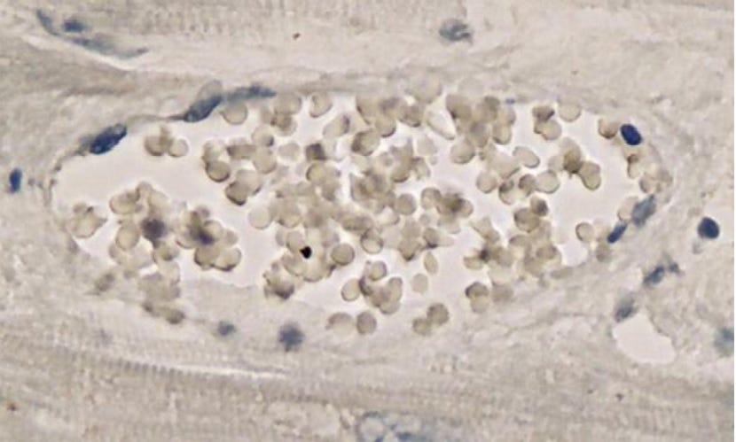 Mörz Figure 4a: Vasculitis (inflammation of the blood vessel wall) in the brain. This is a cross section through a capillary vessel showing prominent signs of vasculitis. The vessel is filled with hemolyzed red blood cells, which is normal in autopsy cases (and, therefore, ignorable). The many tiny blue cells that are present in the walls of the vessel (immediately surrounding the hemolyzed red blood cells) include many lymphocytes (inflammatory cells). So, the walls of this vessel are inflamed, which means the vessel is experiencing vasculitis. The next image provides a closer, more detailed view of the right half of this vessel.