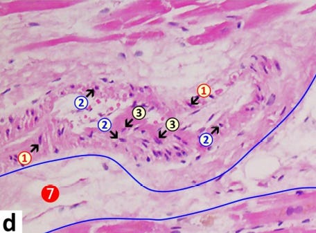 Mörz Figure 5d: This is an arteriole (in the left ventricle of the heart) with signs of inflammation and associated acute degeneration. Lymphocytes (2) have accumulated within the vessel wall; endothelial swelling and vacuolation (3) have occurred; and there is vacuolation of vessel wall myocytes (muscle cells in the wall of the vessel) with signs of karyopyknosis (1). Within the vascular lumen (the open channel of the vessel), note plasma coagulation/fibrin clots adhering to the endothelial surface, indicative of endothelial damage. 1=pyknotic vascular myocytes, 2=lymphocytes, 3= swollen endothelial cells, 4=macrophages, 5=necrotic cardiomyocytes, 6=eosinophilic granulocytes, 7 (blue line)=interstitial edema.