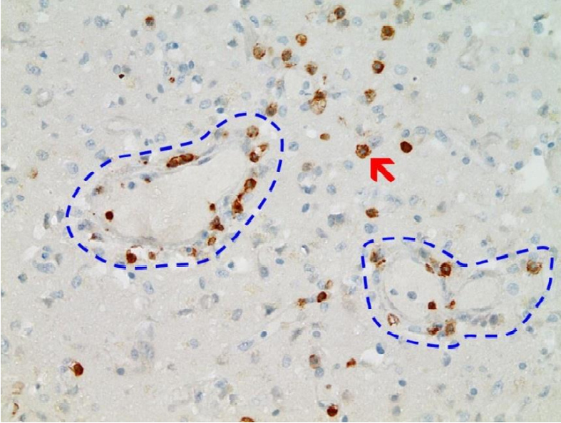 Mörz Figure 8: Frontal brain. Immunohistochemistry for CD3 (expressed by T-Lymphocytes) shows numerous CD3-positive lymphocytes (brown granules, red arrow highlights an example), particularly within the endothelium, but also in the brain tissue, indicative of lymphocytic vasculitis and encephalitis. Blue dotted lines: blood vessels. This image conclusively documents the accumulation of lymphocytes in the vessel wall (vasculitis) and in brain tissue (encephalitis).