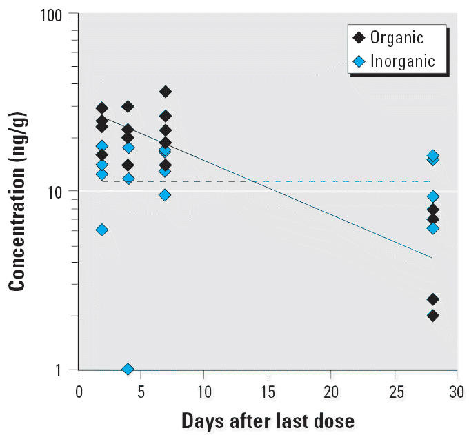 The blue diamonds represent the inorganic form of mercury from thimerosal. See how flat the line is? No clearance. That’s far worse than methylmercury, which is shown in another Figure in the Burbacher et al. paper.