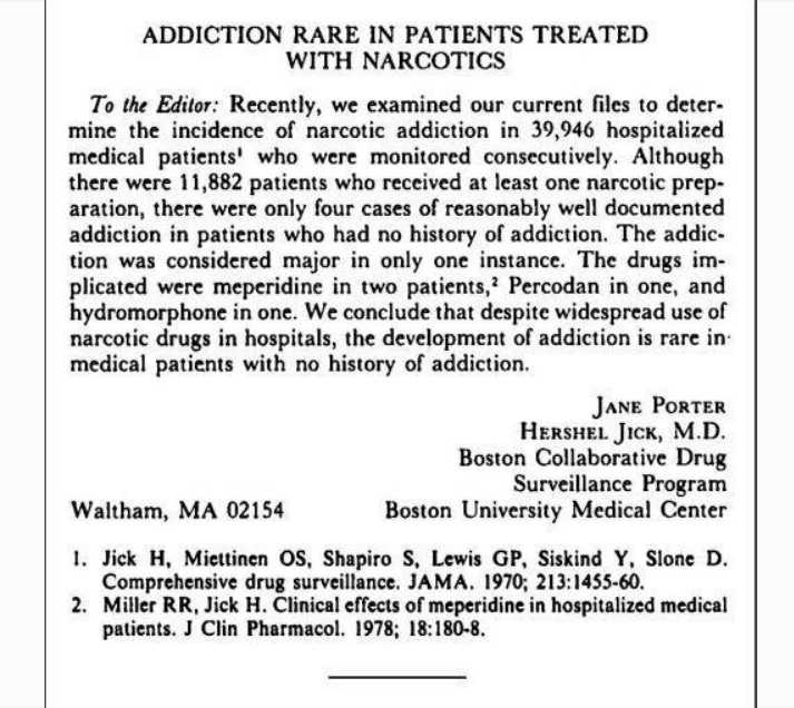 All of this could have been prevented were it not for a five-sentence letter published in by Porter and Jick in 1980 by the New England Journal of Medicine.