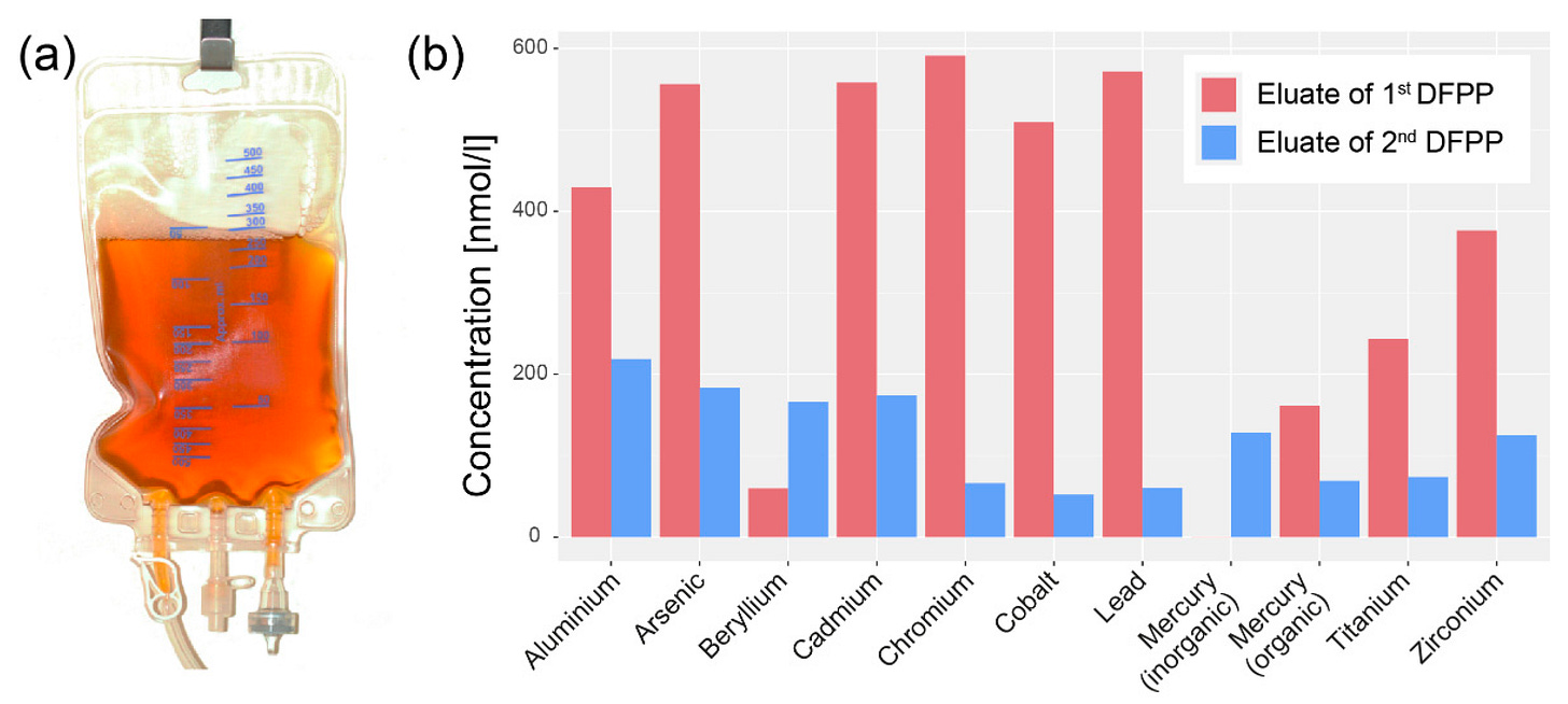 The new study is of pollutants and toxins found in the extract of eluate from double-filtration plasmapheresis plasma exchange.