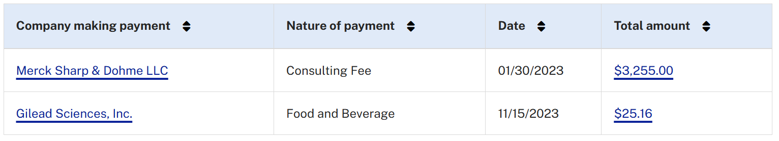 Merck is a major manufacturer of multiple vaccines, including Gardasil (HPV) and MMR, both of which fall under ACIP deliberations. Receiving thousands of dollars from a vaccine manufacturer in the year prior to ACIP appointment presents a potential conflict of interest, especially considering she would be voting on policies that could directly benefit such companies (Source of COI: CMS Open Payments).